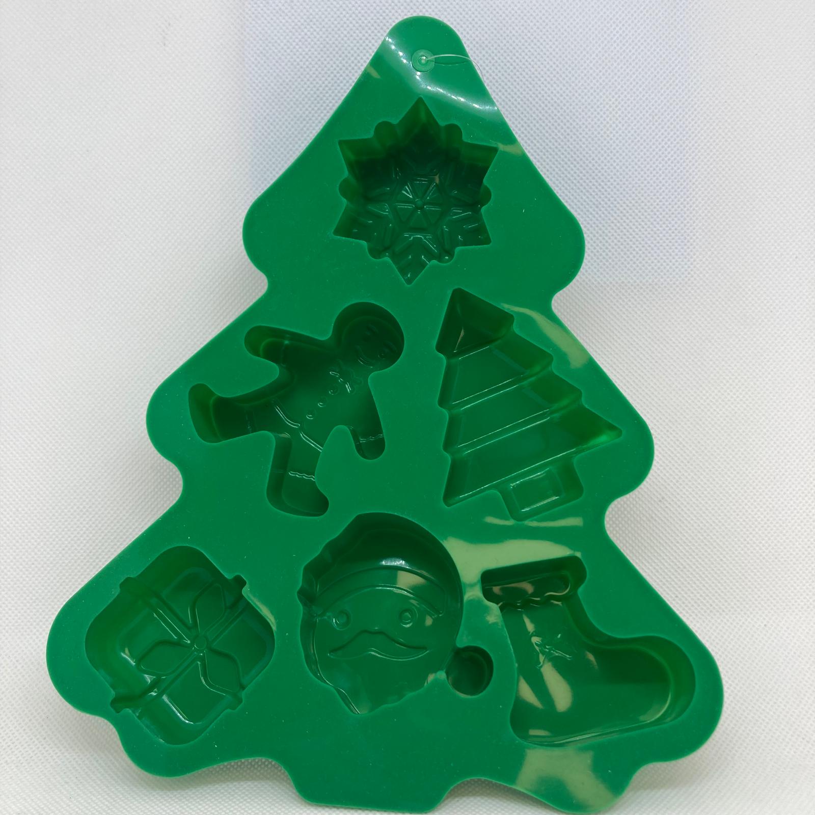 A silicone mould from Flying Tiger Copenhagen in a Christmas tree shape with a snowflake, tree, gingerbread person, stocking, present and Father Christmas shapes.
