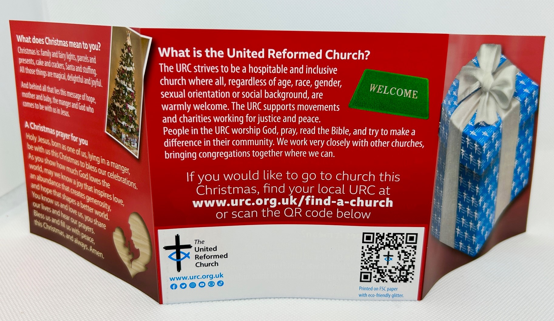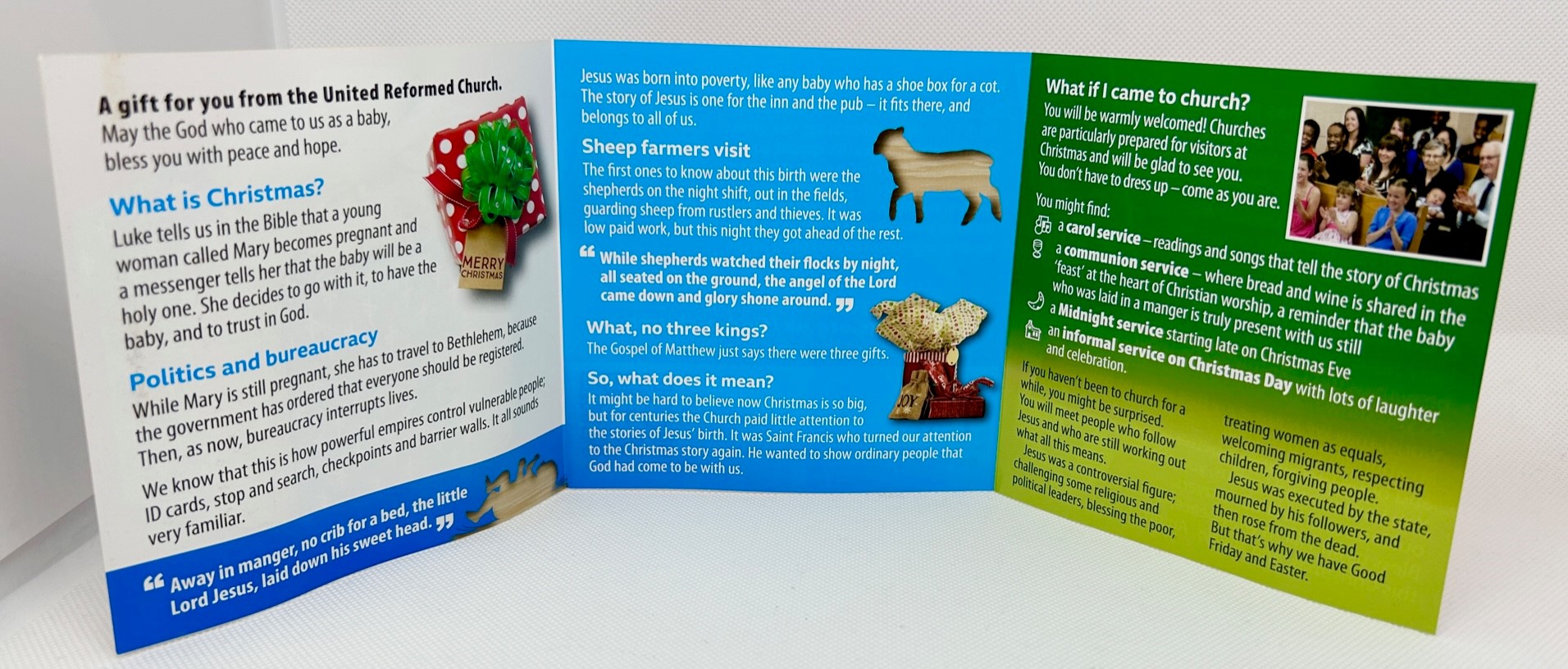 Printed on FSC certified paper and using eco glitter, this leaflet is meant to be given away at churches, posted through letterboxes, or given away at concerts, shopping centres, schools, care homes – wherever you tell others about the real meaning of Christmas.