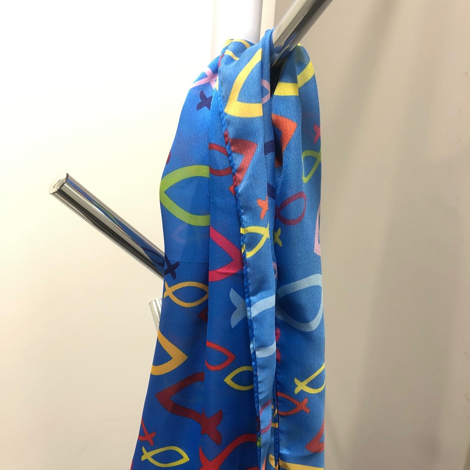 Back in stock by popular demand, a lightweight polyester scarf measuring 2m x 80cm in the URC’s blue and multi-coloured fish design.