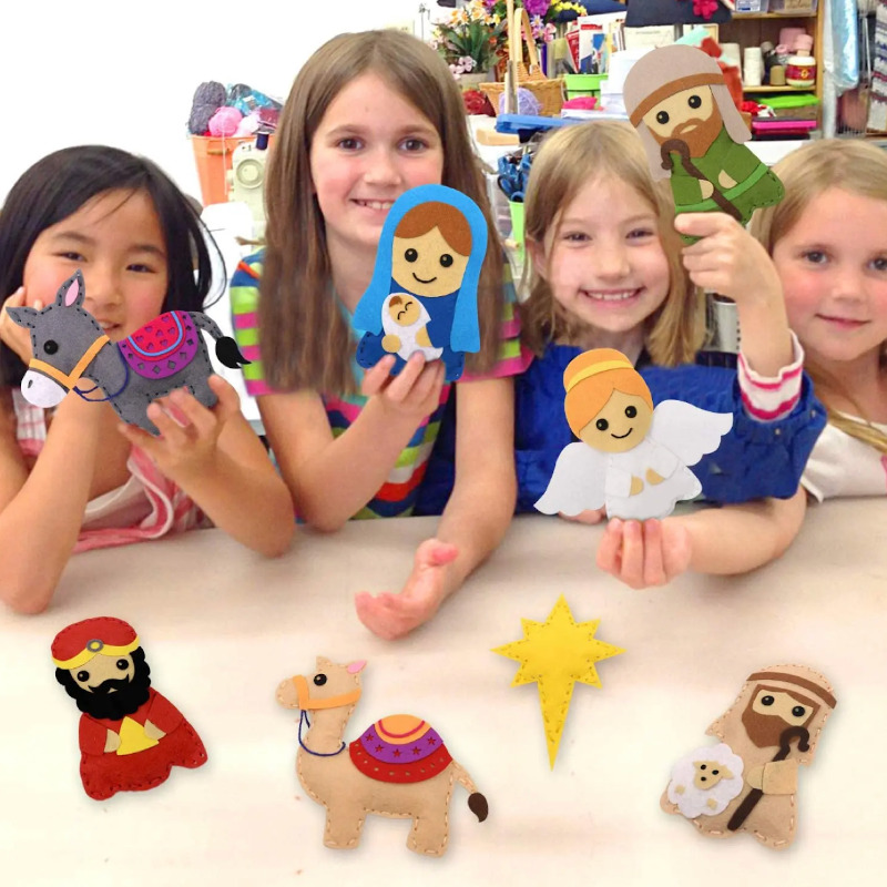Pre-cut felt shapes to be sewn together with wool, included, and decorated, all decorations are also included, to make an Angel, Mary and the Baby Jesus, Joseph, a Shepherd, the three Wise Men, a donkey, a camel, the star and the stable. Scissors and stuffing are also included, along with a set of instructions.