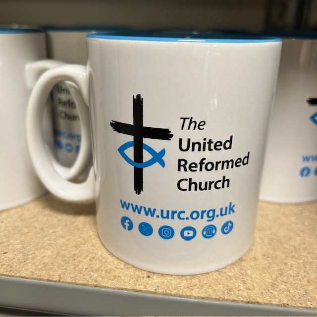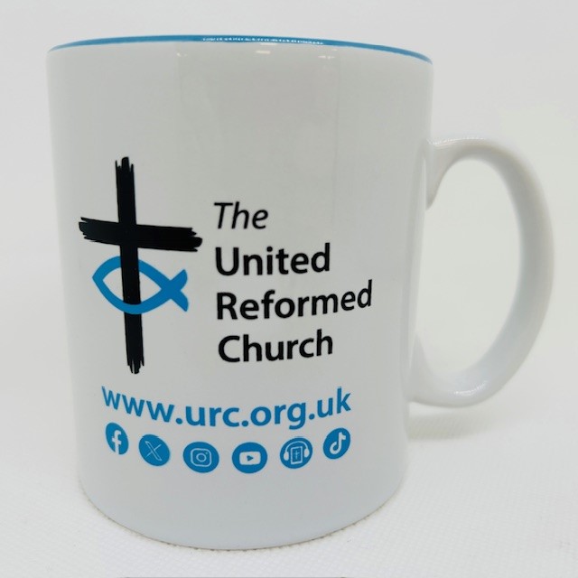 White mug with the URC logo, website and social media channels. New design now featuring a blue interior. Discounts for orders of 10 or more mugs. Use the Coupon Code MUG at the checkout.