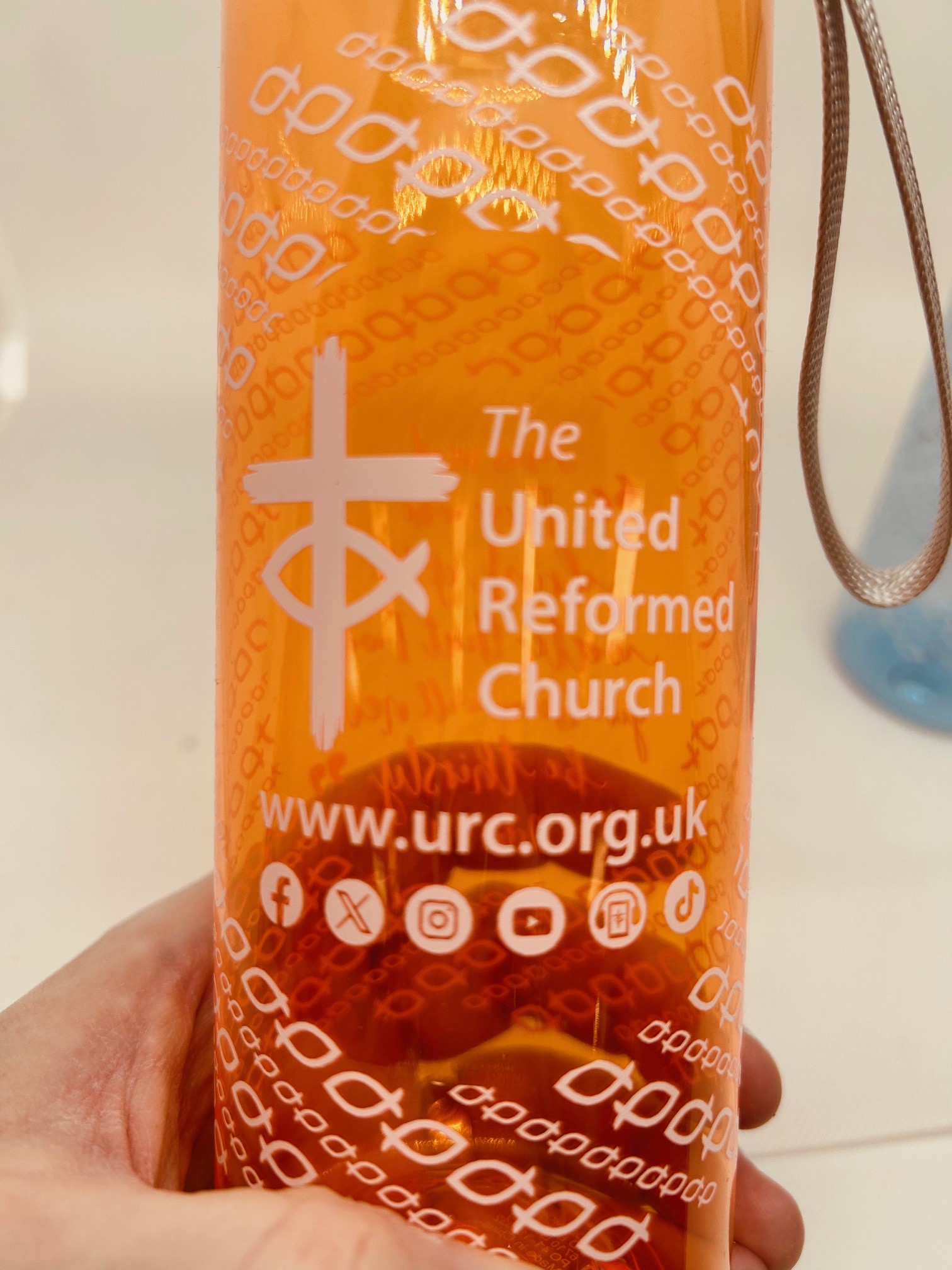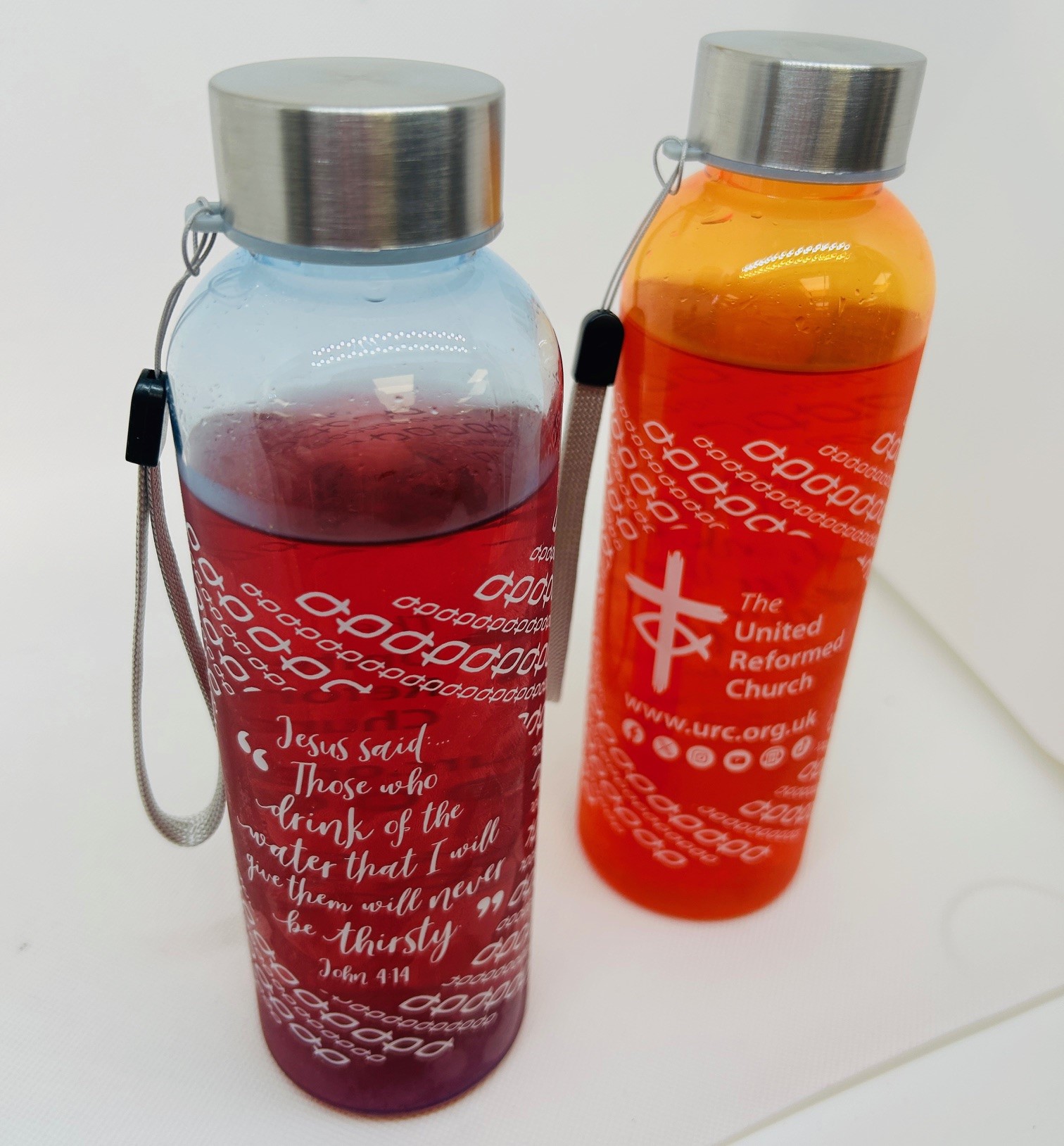 Each bottle comes with the URC logo and the text from the Gospel of John 4:14, “Jesus said: Those who drink of the water that I will give them will never be thirsty.”